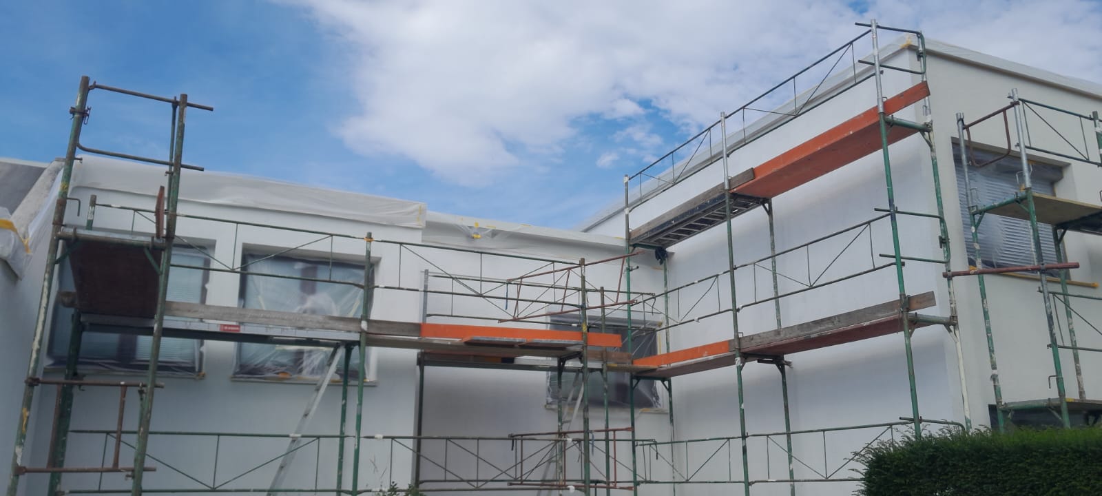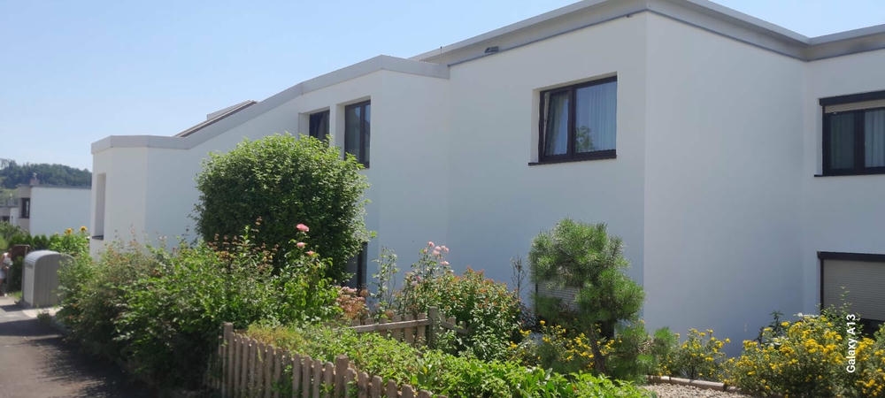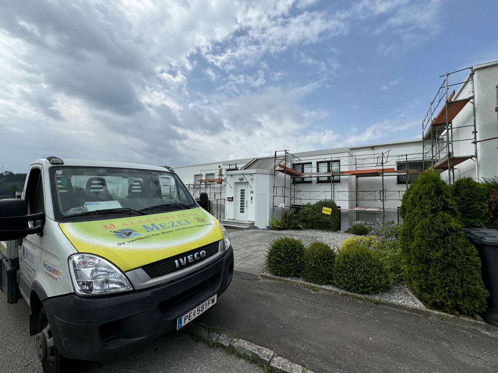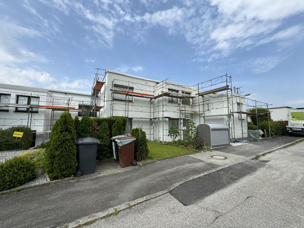 Großprojekt in Puchenau: Fassadenmalerei auf über 3.000 m² – ausgeführt mit hochwertiger Carbosol Fassadenfarbe. Die Fassade wirkt wieder modern, gepflegt und ist optimal gegen Witterungseinflüsse geschützt.